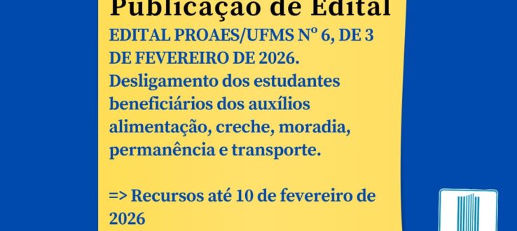 EDITAL PROAES/UFMS Nº 6, DE 3 DE FEVEREIRO DE 2026- DESLIGAMENTO DOS ESTUDANTES BENEFICIÁRIOS DOS AUXÍLIOS ALIMENTAÇÃO, CRECHE, MORADIA, PERMANÊNCIA E TRANSPORTE.
