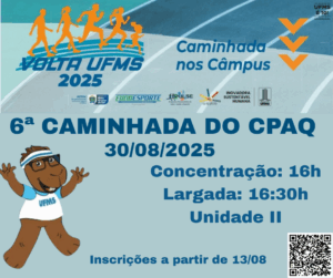 A caminhada no Câmpus de Aquidauana acontecerá no dia 30 de agosto, com concentração a partir das 16h, no estacionamento da Unidade II. A caminhada é aberta para todos os públicos e as inscrições podem ser realizadas NESTE LINK a partir de hoje dia 13/08/2024.
