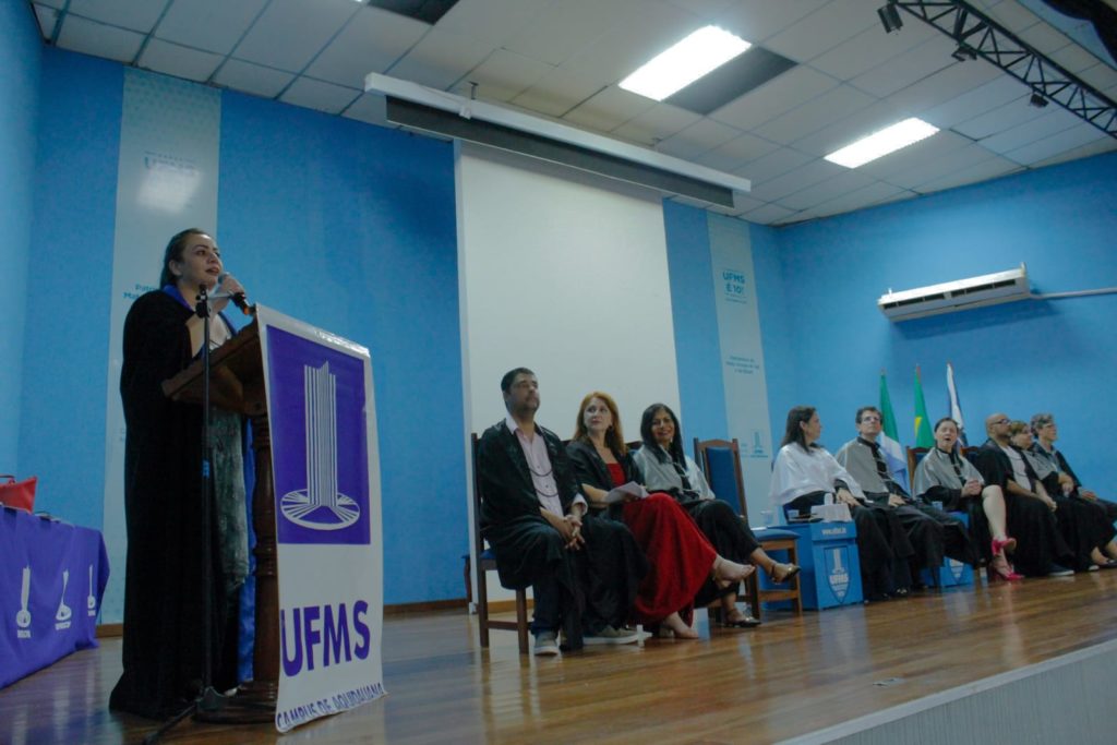 A diretora do CPaq, Ana Graziele Toledo, enfatizou o papel da paixão para a transformação social. “Cada estudante que se apaixonar pela sua profissão será a nossa UFMS, o nosso Câmpus de Aquidauana espalhando pelo mundo a crença de que a educação não só transforma, a educação salva. A educação salvou a minha vida e eu tenho certeza que salvou a vida de muitos de vocês. Tenham orgulho, meus queridos formados, egressos, colegas de profissão. Tenham muito orgulho da tatuagem acadêmica que vocês levam hoje. A tatuagem de vocês é: sou UFMS!”.