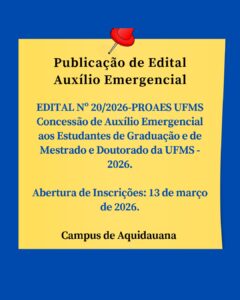 EDITAL Nº 20/2026 – PROAES UFMS Concessão de Auxílio Emergencial aos Estudantes de Graduação e de Mestrado e Doutorado da UFMS