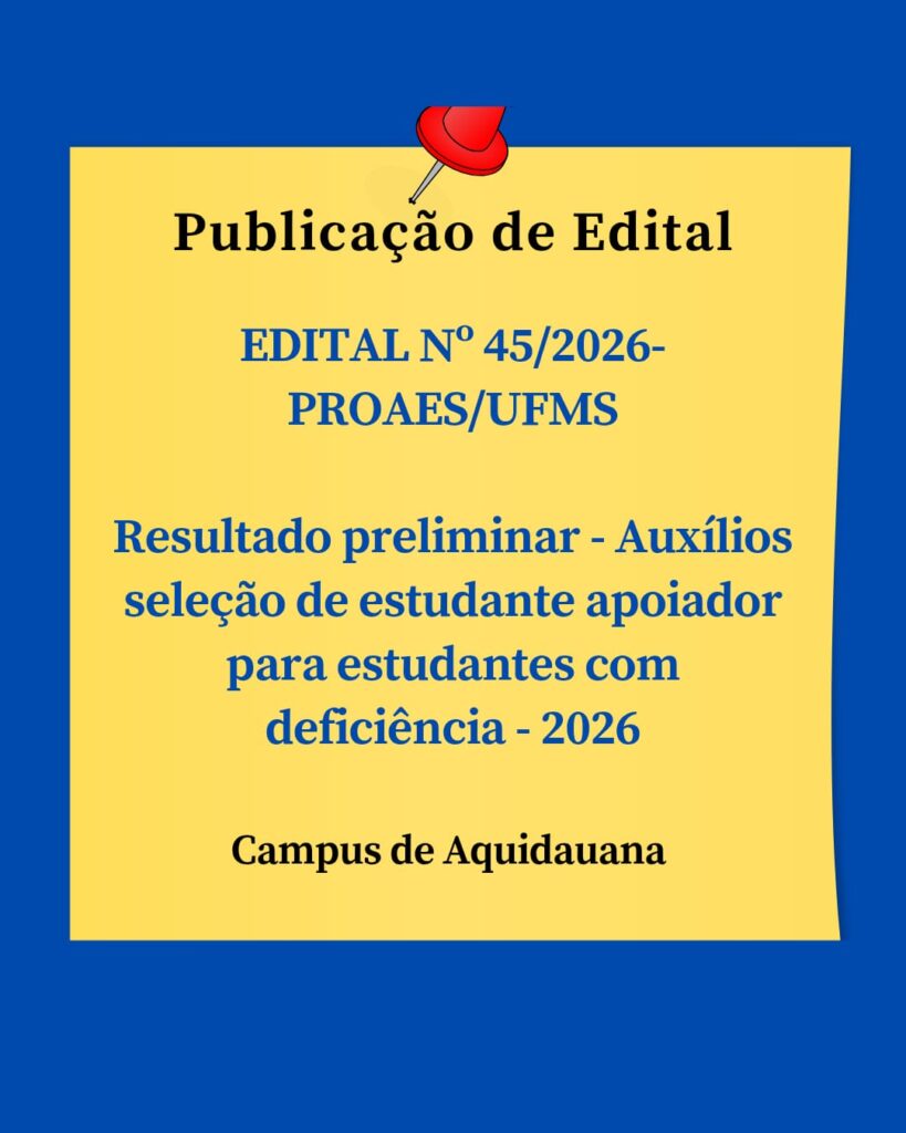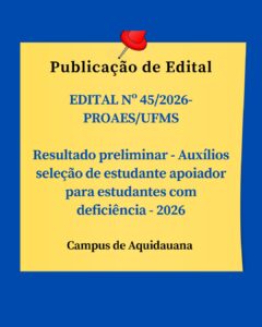 EDITAL Nº 45/2026-PROAES/UFMS RESULTADO PRELIMINAR – AUXÍLIOS SELEÇÃO DE ESTUDANTE APOIADOR PARA ESTUDANTES COM DEFICIÊNCIA