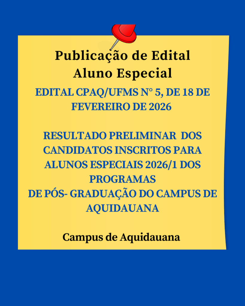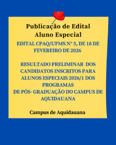 EDITAL Nº 5-CPAQ/UFMS, DE 18 DE FEVEREIRO DE 2026- Resultado Preliminar dos Candidatos Inscritos para Aluno Especial 2026/1 dos Programas de Pós-Graduação do Campus de Aquidauana