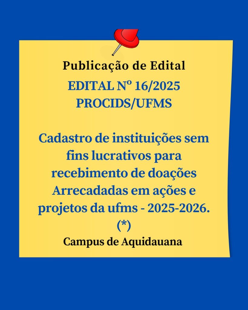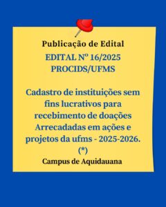 (Português do Brasil) EDITAL Nº 16/2025-PROCIDS/UFMS – Cadastro de instituições sem fins lucrativos para recebimento de doações Arrecadadas em ações e projetos da ufms – 2025-2026. (*)