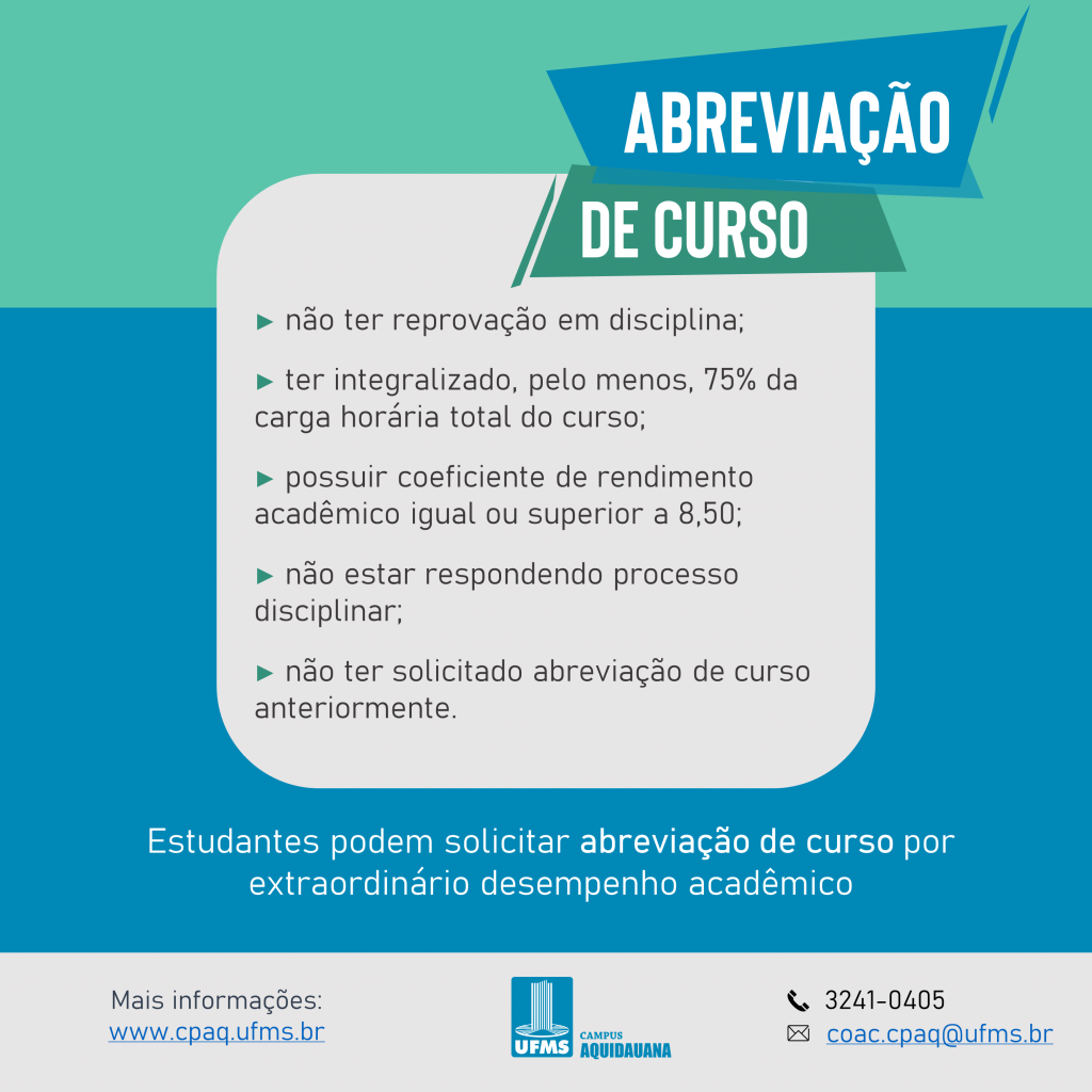 Com isso, o estudante que tenha extraordinário aproveitamento nos estudos poderá solicitar a abreviação da duração do seu curso, desde que atendidos os requisitos estabelecidos pela UFMS. A Abreviação de Curso consiste na dispensa de cursar componentes curriculares que faltam para integralização da estrutura curricular e carga horária total do curso e dar-se-á por meio da realização de Exame de Suficiência, aplicado por Banca Examinadora Especial.
