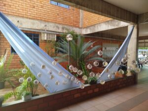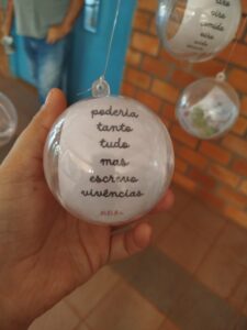 Desde o dia 18 de novembro, o Campus de Aquidauana foi agraciado com a exposição “Despejo – do quarto à Aldeinha, do diário às aldravias”, trazida pelo Centro Cultural juntamente com os projetos Negritude em Debate e Territórios de Escrevivências em alusão ao dia da Consciência Negra, da professora Ana Paula Batarce . A instalação de aldravias revestidas de bolinhas transparentes em acrílico, organizada por Flávia Rohdt, coordenadora da ABRAAI (Academia Brasileira de Autores Aldravianistas Infantojuvenil) é resultado da inspiração de crianças e adolescentes indígenas da Aldeinha.