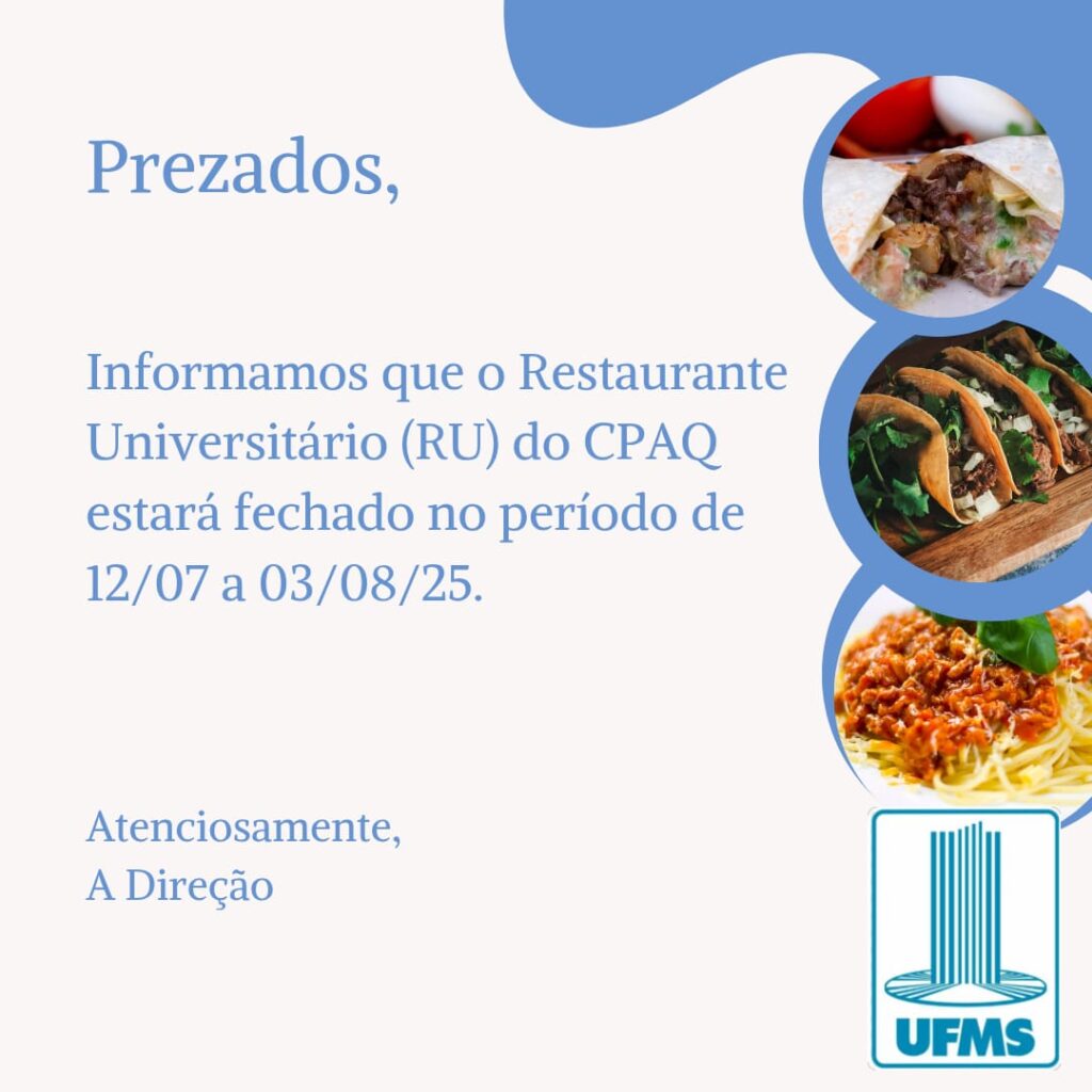 Informamos que, durante o período de 12/07/2025 a 03/08/2025, as atividades do Restaurante Universitário (RU) do Campus de Aquidauana estarão suspensas. As atividades serão retomadas normalmente após o encerramento do recesso acadêmico.