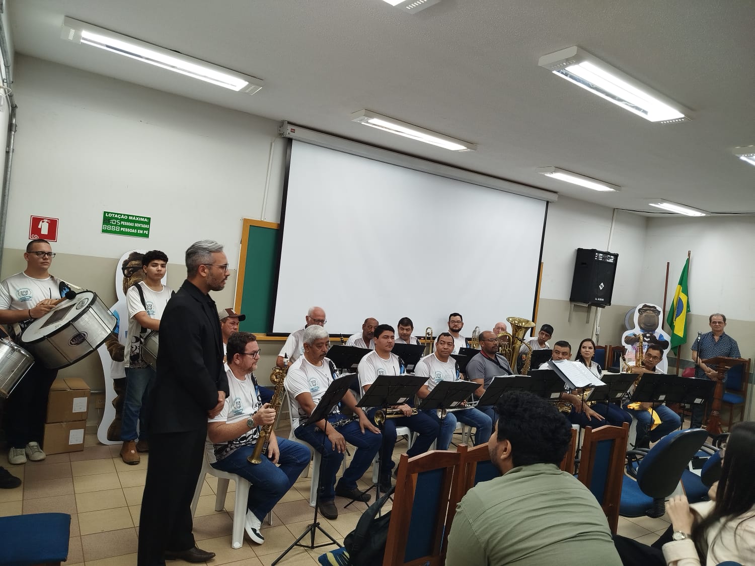 Em seguida, a Banda Municipal de Aquidauana Otávio Mongeli, dirigida pelo maestro Isac Fonseca, presenteou o público com uma apresentação de canções populares bastante conhecidas de todos. Logo depois, o professor organizador, José Alonso Tôrres Freire, agradeceu à Banda pela apresentação e conduziu o evento. Em sua fala, o professor destacou os vários projetos culturais coordenados por ele e que levaram ao livro “Por mares nunca dantes navegados”.