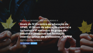 Já estão disponíveis para acesso os Anais do IV Encontro de Educação da UFMS, VI Fórum de Educação Especial e Inclusiva e VI Encontro do Grupo de Estudos e Pesquisas em Formação Interdisciplinar de Professores (Gepfip).