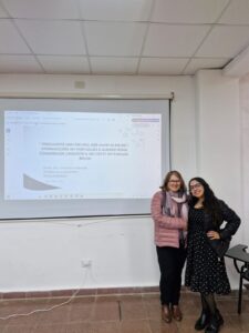 Acompanhada de sua orientadora, Prof. Dra. Cristiane Schmidt, Ana Júlia participou de um encontro científico compartilhando os resultados de seu trabalho “Produção de Documentário Memorialístico: Autobiografias de Professores de Línguas”.