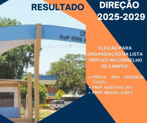 Na mesma reunião, o Conselho organizou a lista tríplice composta pelos candidatos que participaram da Consulta – Profa. Ana Graziele e Prof. Miguel – e pelo Prof. Gustavo da Silva, indicado pelo Conselho de Câmpus para compor a lista, seguindo os normativos vigentes. Na eleição conduzida pelo Conselho, o resultado foi: Profa. Ana Graziele – 11 votos; Prof. Gustavo – 3 votos; e Prof. Miguel – 1 voto.