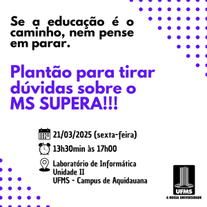 No dia 21/03, no laboratório de informática da Unidade II, das 13h30 às 17h, será realizado um plantão para tirar dúvidas sobre o MS SUPERA.