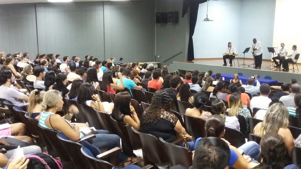 Em brilhante apresentação, o Quarteto de Saxofones da UFMS reuniu, nesta quinta-feira (26/11/2015), no Anfiteatro Professora Dóris Mendes Trindade, na Unidade I do Câmpus de Aquidauana (CPAQ), acadêmicos de diversos cursos, docentes, técnico-administrativos e comunidade externa.