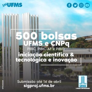 Para o período de 2020 a 2021, a UFMS e o Conselho Nacional de Desenvolvimento Científico e Tecnológico (CNPq) ofertam aos acadêmicos de graduação presencial 500 bolsas de iniciação científica e de iniciação tecnológica e inovação. A seleção das propostas está em andamento e a inscrição pode ser feita pelos docentes e técnicos administrativos até 14 de abril no Sigproj.