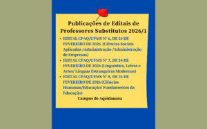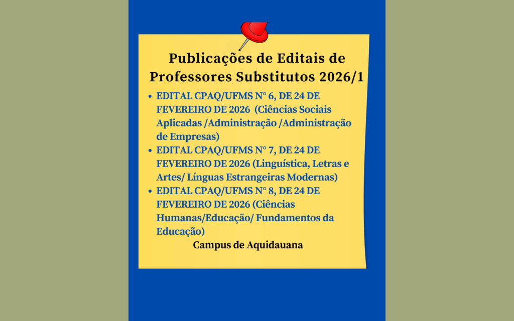O Câmpus de Aquidauana da Universidade Federal de Mato Grosso do Sul (CPAQ/UFMS) informa que estão publicados os editais de abertura de processos seletivos para contratação de Professores Substitutos para o primeiro semestre letivo de 2026.