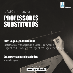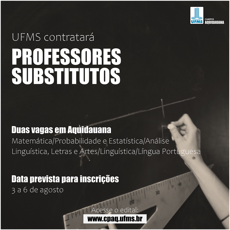 No Campus de Aquidauana (CPAQ), há duas vagas, distribuídas entre os áreas de Matemática/Probabilidade e Estatística/Análise e Linguística, Letras e Artes/Linguística/Língua Portuguesa.